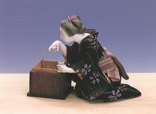 | Any time, of the era, it's a difficult thing for women to make a living by herself. She finishes her task in day time, perhaps, teaching songs with SAMISEN (traditional string instrument) and now enjoy evening drink to encourage herself. |