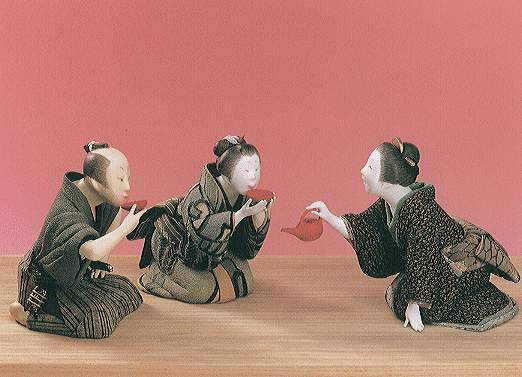 | A Figure at the very left shows the second son born in HATAMOTO House (a direct feudatory of the SHOGUN). At that time, the house is to be succeeded by the eldest son. So unless he finds an adoptive family, the second son must lead his life as a dependent of his elder brother. On second thought, he lives free from care with no obligation. Today, he joins a drinking carouse with mistress and waitress of the restaurant. |