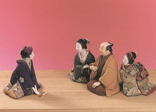 | Once, a theatre going was a luxurious hobby. A Tea House is accomodated in front of a play house where people arrive in ample time before the raising of the curtain. They change KIMONO (Clothes) to their gala attire, take some meals and/or drinks and sometimes, a patron invites his favorite KABUKI actor to give a tip. A rich merchant takes his daughter and GEISHA girl to share such a joyful time and a young daughter is having a hard time calming herself by watching a beautiful OYAMA (Kabuki actor in female character) over her father's back. |